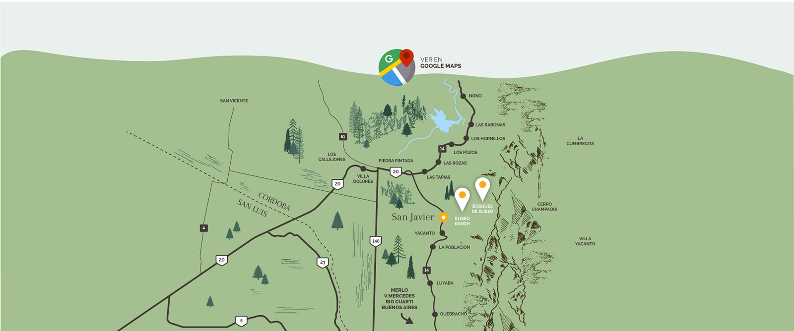 Se encuentra en el barrio privado de San Onofre a 2 km. Del Centro de San Javier, a 15 km de Villa Dolores, subiendo hacia las Sierras Comechingones, en dirección al Cerro Champaquí, el más amplio de la provincia de Córdoba.